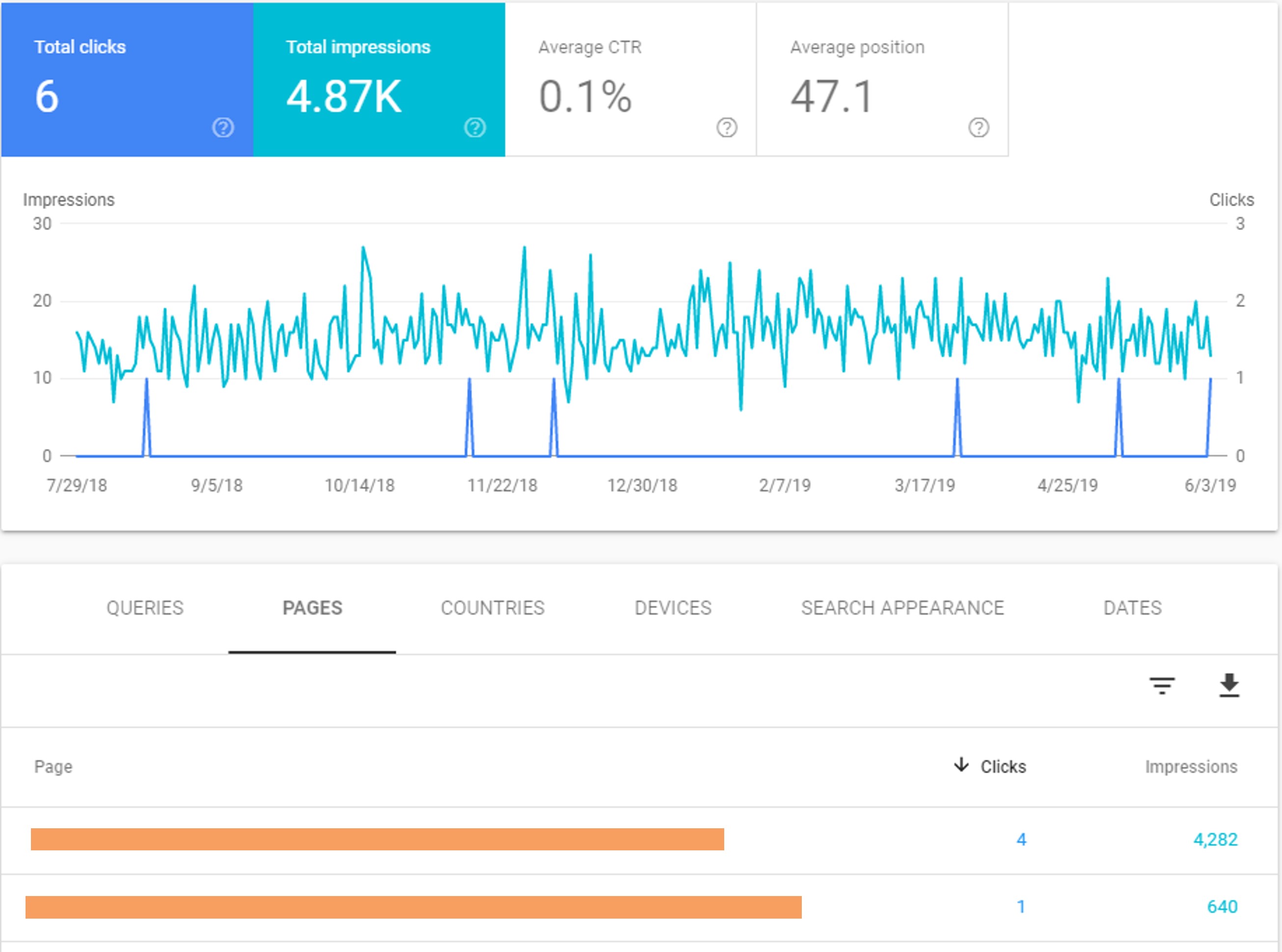 Therefore, neither of these pages were performing particularly well for this keyword. You can see that the impressions are very high but the clicks are very low, due to each page not ranking high enough to receive consistent clicks.